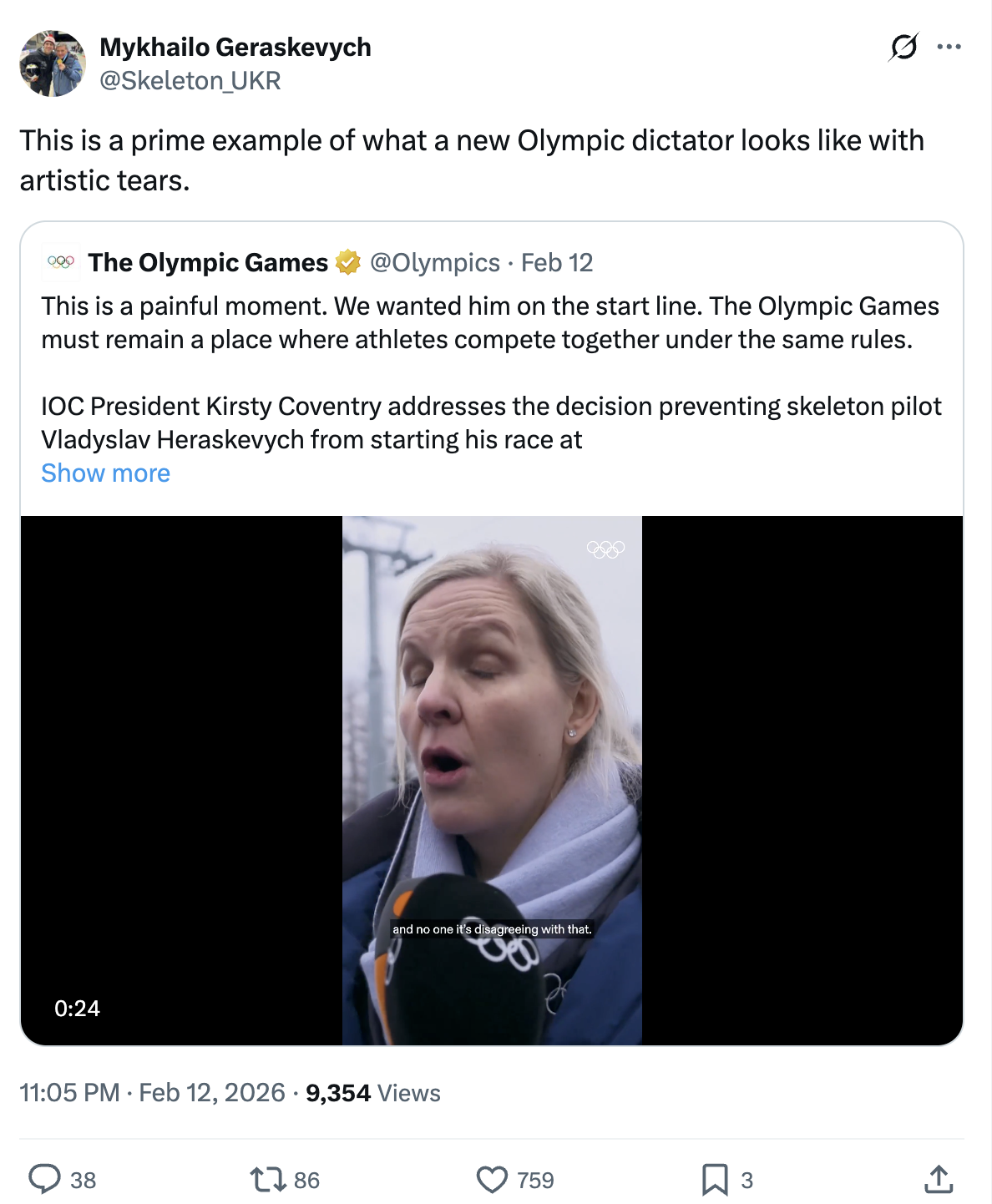 In a power play that underscores the power of one person to influence global opinion in the age of social media, and at lightning speed, Vladyslav Heraskevych became a way to show support for Ukraine, to shout against Russia, to decry the war, to stand up for the little guy, to complain about the IOC, to allege (without evidence, much less proof of) undue Russian influence in or on the IOC and president Kirsty Coventry — all of that and more.