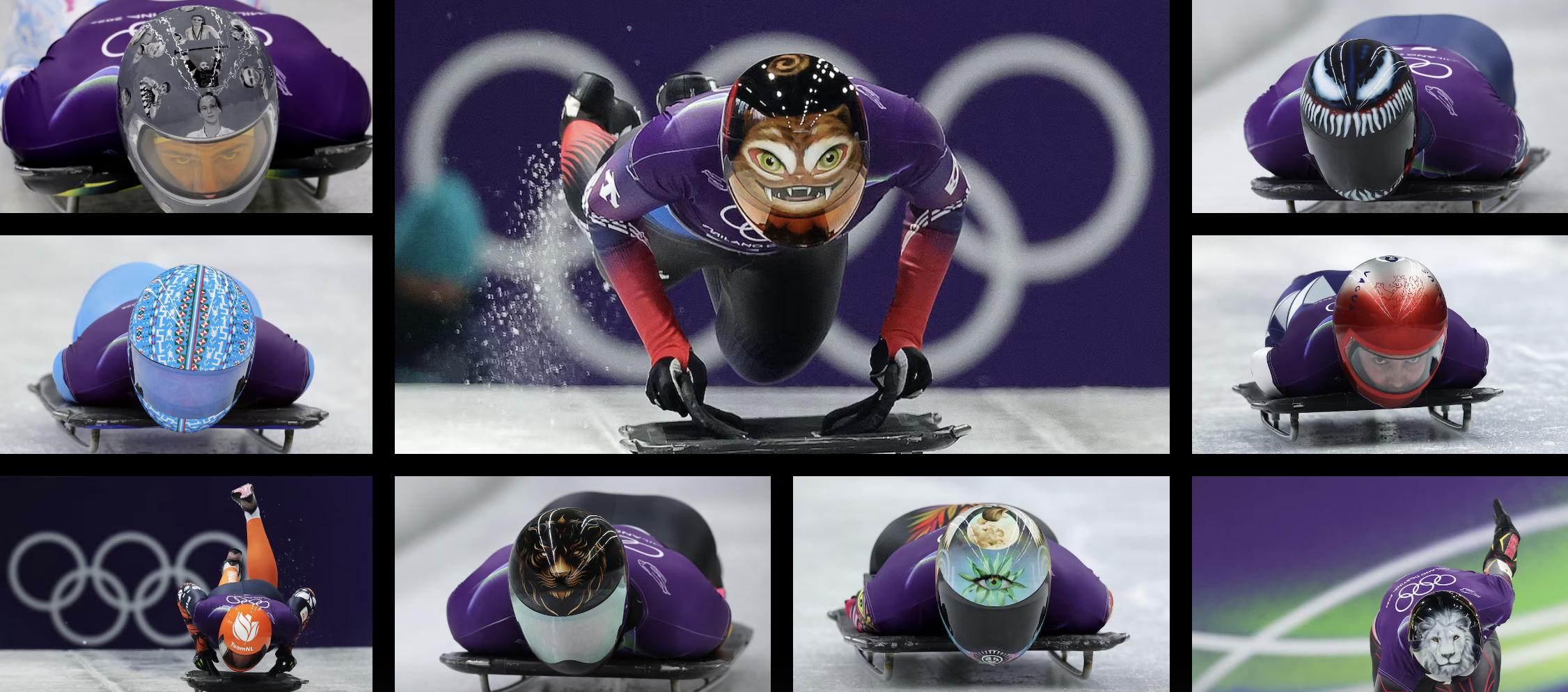 Just some of the skeleton helmets here at these Winter Games, men’s and women’s, collected by Reuters