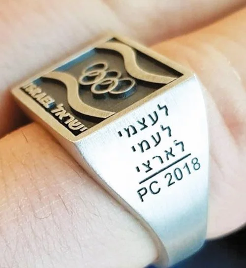 Edelman’s 2018 Olympic ring. The Hebrew inscription says, ‘For myself, for my people, for my country’ // JewishLink