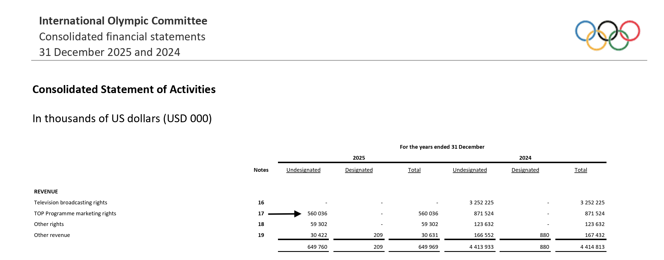 In 2025, the IOC brought in $560 million in TOP revenues. Compare: $871.5 million in 2024. That’s a drop of $311.5 million.