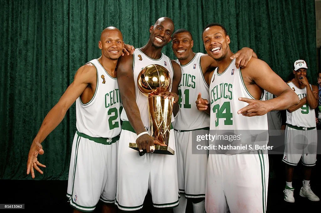 Ray Allen, Kevin Garnett, James Posey and Paul Pierce with the Larry O'Brien NBA championship trophy in June 2008 // Getty Images // Nathaniel S. Butler