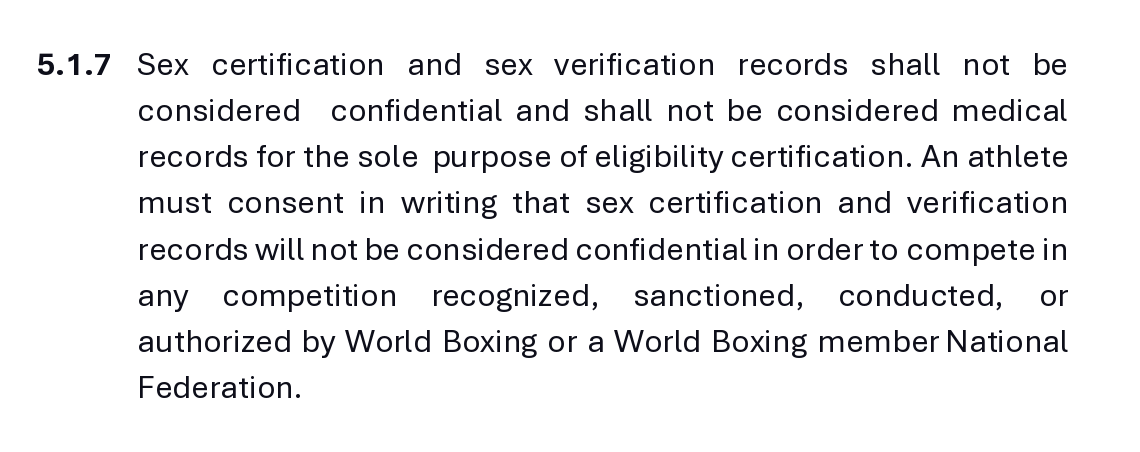World Boxing section 5.1.7, meantime, says “sex certification and sex verification records shall not be considered confidential and shall not be considered medical records for the sole purpose of eligibility certification.”